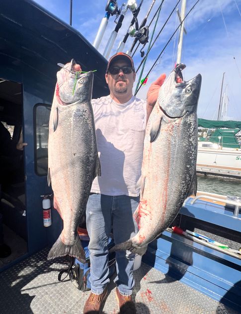 we went out to the same area we caught our fish yesterday and the bite was good but it wasnt wide open due to heavy pressure. we had multiple hookups and lost a lot of fish due to the barbless hook law. we should have had limits but we only got 4 in the boat. they were still nice quality and it was still a great day with plenty of whale action . at one point i had a full grown grey whale come up right off my bow.